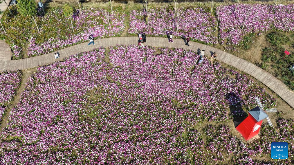 BEIJING, 5 noviembre, 2025 (Xinhua) -- Vista aérea tomada con un dron el 5 de noviembre de 2025 de personas admirando la floración en un área escénica, en el distrito de Guangrao de la ciudad de Dongying, en la provincia de Shandong, en el este de China. (Xinhua/Liu Yunjie)