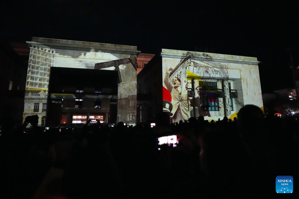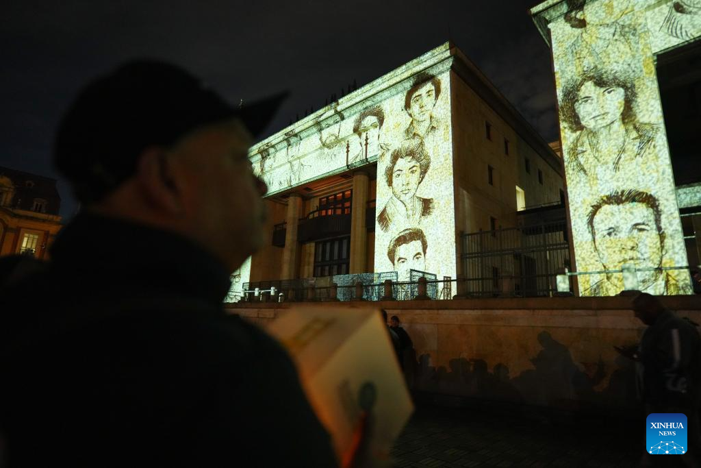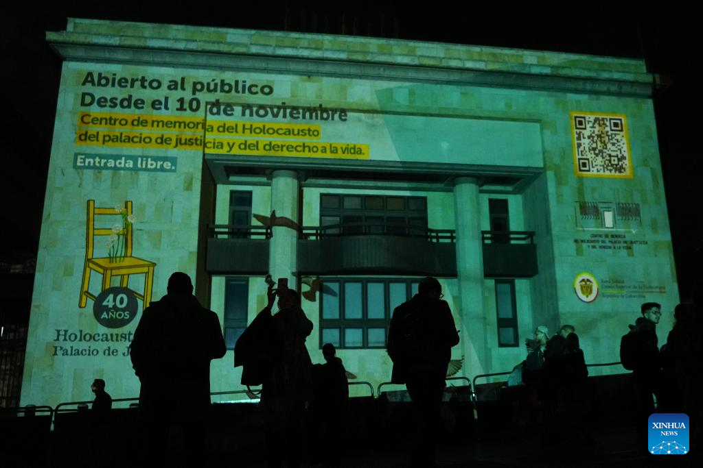 BOGOTA, 7 noviembre, 2025 (Xinhua) -- Imagen del 6 de noviembre de 2025 de personas observando la proyección de un video sobre la fachada del Palacio de Justicia durante la conmemoración por los 40 años de la toma del Palacio de Justicia ocurrida en 1985, en Bogotá, Colombia. Los colombianos conmemoraron el 6 de noviembre con diferentes actos simbólicos los 40 años de uno de los episodios más oscuros de la historia reciente del país, la toma en 1985 del Palacio de Justicia en Bogotá por un comando de la entonces guerrilla Movimiento 19 de Abril (M-19) con saldo de un centenar de personas fallecidas. (Xinhua/Andrés Moreno)