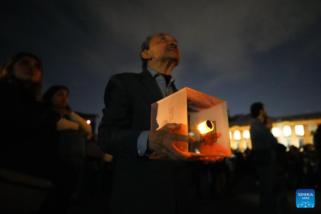 BOGOTA, 7 noviembre, 2025 (Xinhua) -- Imagen del 6 de noviembre de 2025 de un hombre sosteniendo una caja de luz mientras asiste a la proyección de un video sobre la fachada del Palacio de Justicia durante la conmemoración por los 40 años de la toma del Palacio de Justicia ocurrida en 1985, en Bogotá, Colombia. Los colombianos conmemoraron el 6 de noviembre con diferentes actos simbólicos los 40 años de uno de los episodios más oscuros de la historia reciente del país, la toma en 1985 del Palacio de Justicia en Bogotá por un comando de la entonces guerrilla Movimiento 19 de Abril (M-19) con saldo de un centenar de personas fallecidas. (Xinhua/Andrés Moreno)