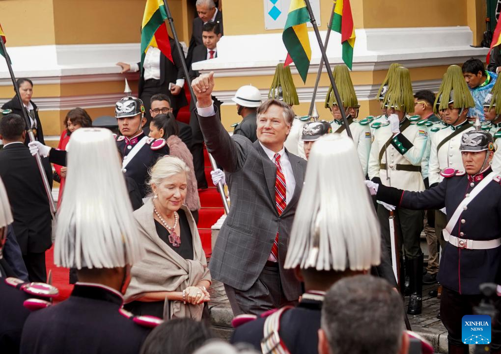 El subsecretario de Estado estadounidense, Christopher Landau (c), saluda a su salida de la Asamblea Legislativa Plurinacional al término de la ceremonia de juramentación del presidente boliviano, Rodrigo Paz, en la ciudad de La Paz, Bolivia, el 8 de noviembre de 2025. Rodrigo Paz juró el sábado como nuevo presidente de Bolivia para el período 2025-2030, con un discurso en el que aseguró que su gestión no estará orientada al control del poder, sino al servicio público. (Xinhua/Javier Mamani)