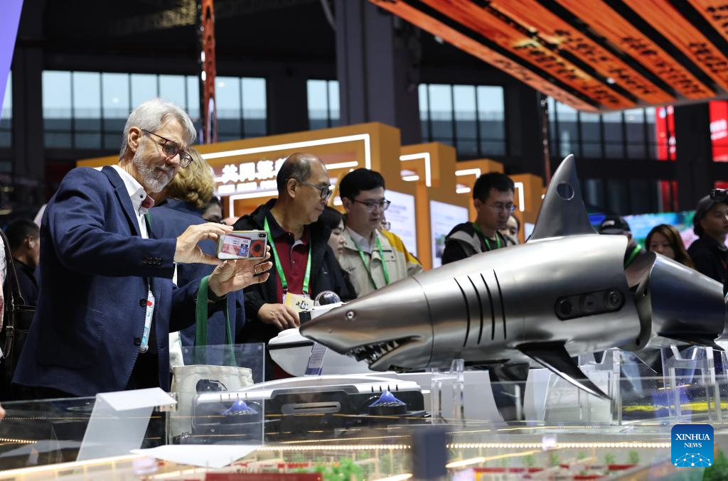 SHANGHAI, 8 noviembre, 2025 (Xinhua) -- Un invitado toma fotografías de un tiburón biónico exhibido en el Pabellón de China durante la VIII Exposición Internacional de Importaciones de China (CIIE, por sus siglas en inglés), en Shanghai, en el este de China, el 8 de noviembre de 2025. Más de 30 talentos extranjeros y sus familias fueron invitados a visitar la VIII CIIE en el Centro Nacional de Convenciones y Exposiciones (Shanghai) durante un evento temático el sábado. (Xinhua/Fang Zhe)
