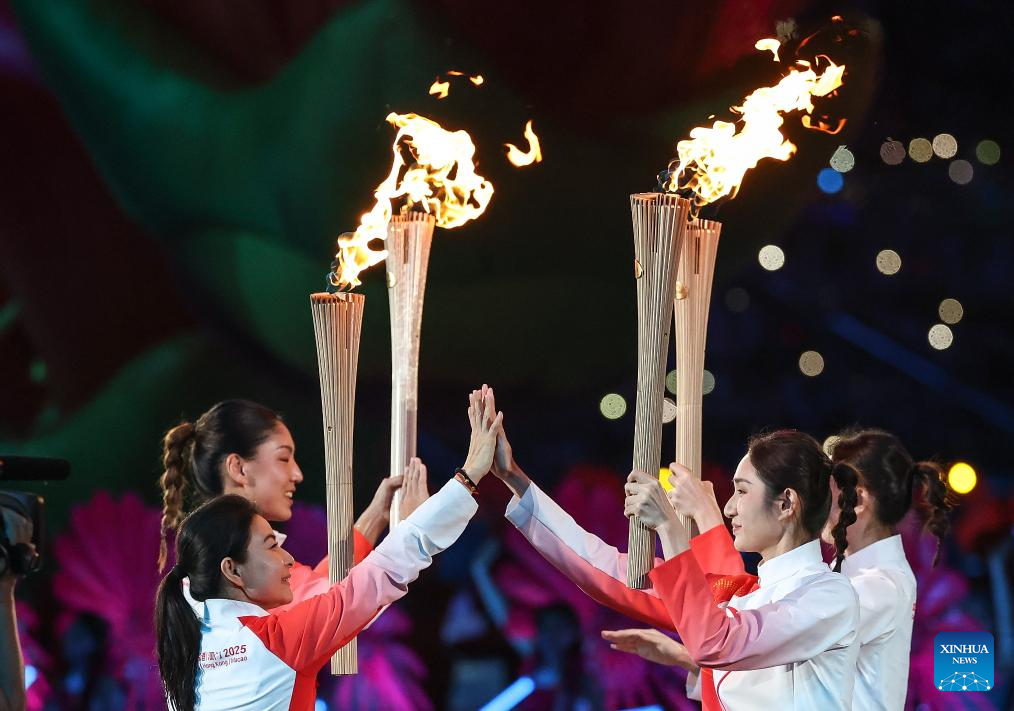 GUANGZHOU, 9 noviembre, 2025 (Xinhua) -- Las portadoras de la antorcha participan en el relevo de la antorcha durante la ceremonia de inauguración de los XV Juegos Nacionales de China, en Guangzhou, en la provincia de Guangdong, en el sur de China, el 9 de noviembre de 2025. (Xinhua/Pan Yulong)