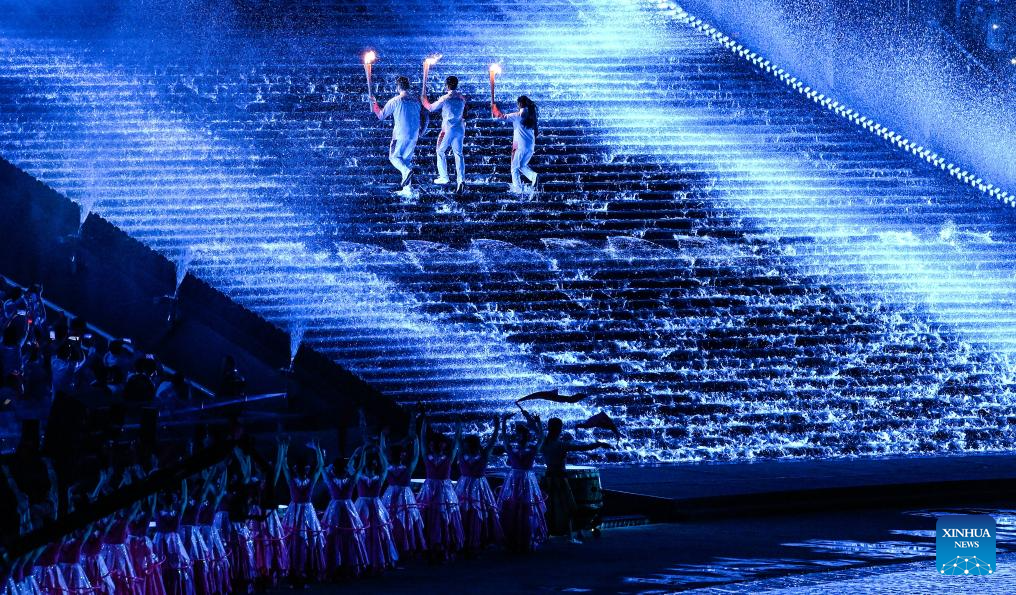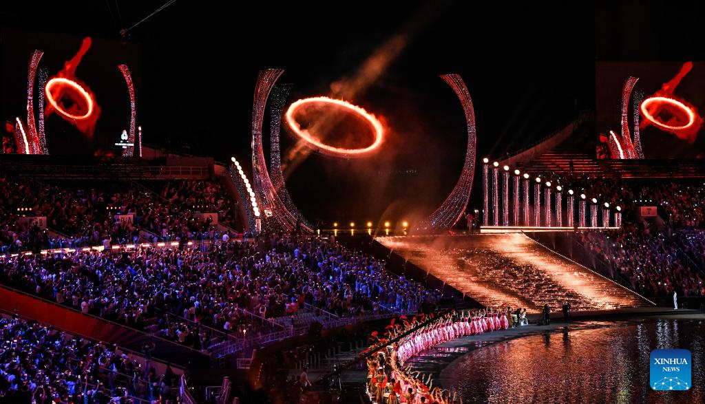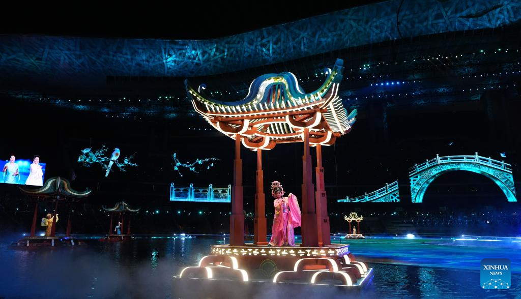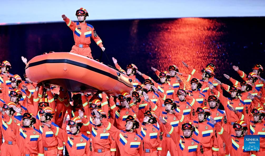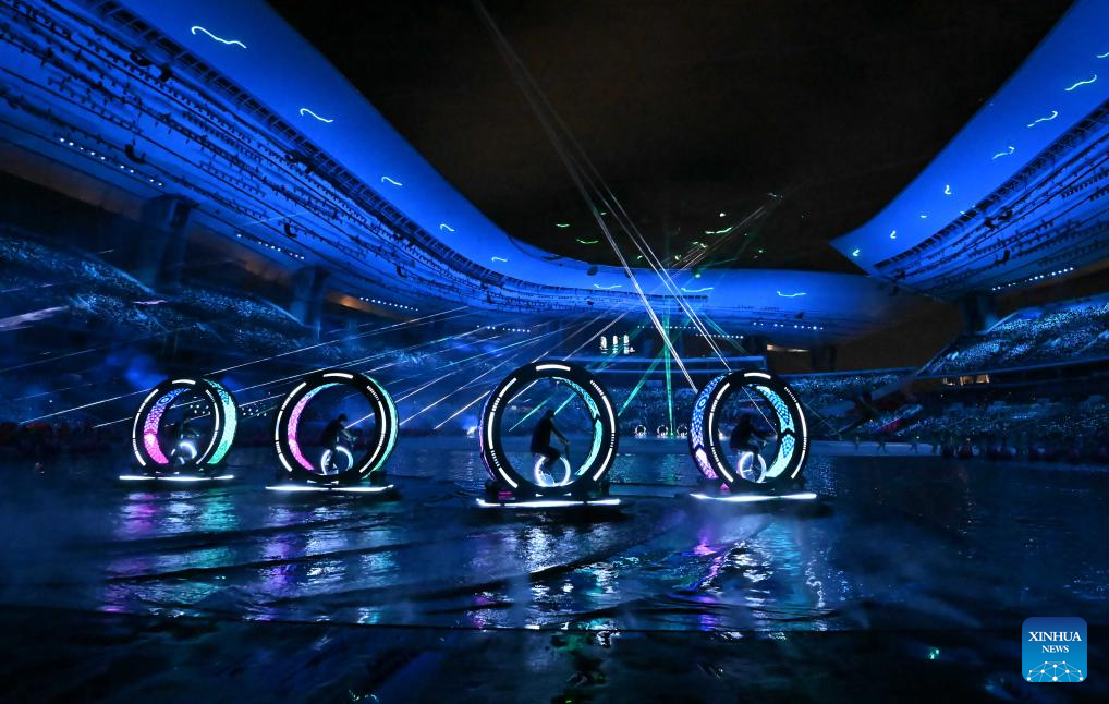 GUANGZHOU, 9 noviembre, 2025 (Xinhua) -- Artistas realizan una presentación durante la ceremonia de inauguración de los XV Juegos Nacionales de China, en Guangzhou, en la provincia de Guangdong, en el sur de China, el 9 de noviembre de 2025. (Xinhua/Deng Hua)
