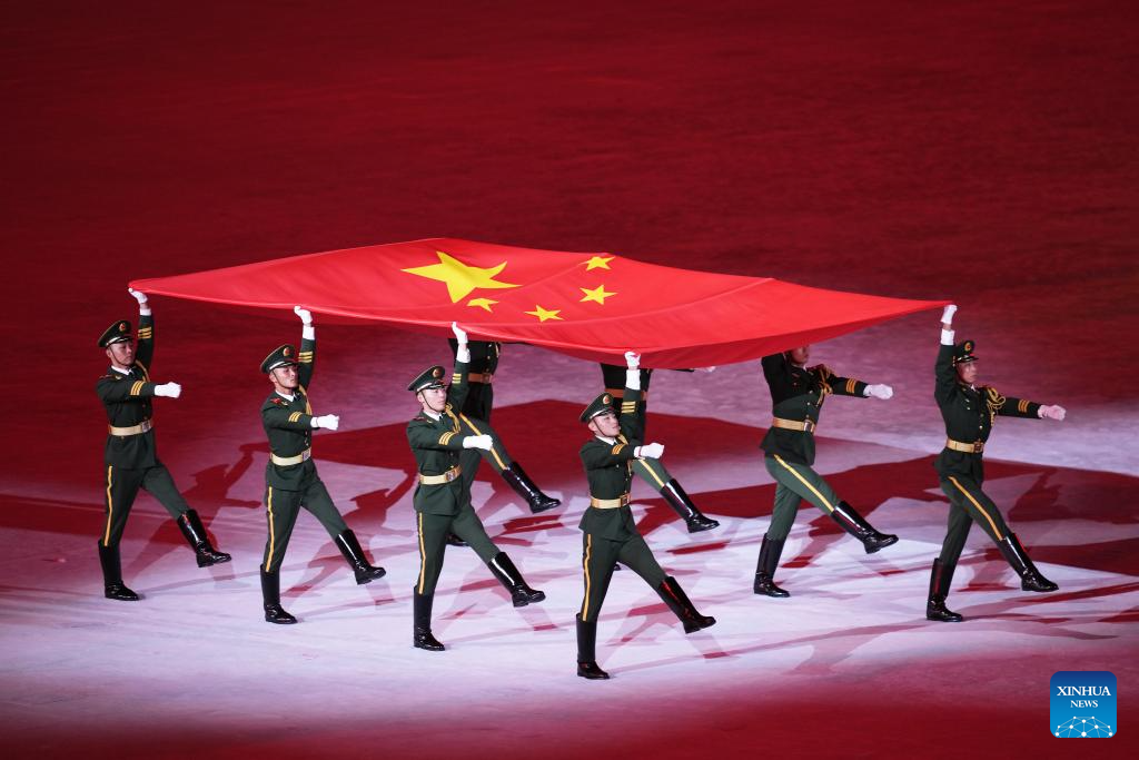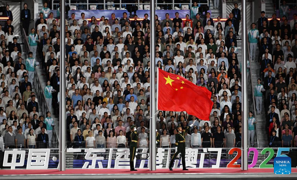 GUANGZHOU, 9 noviembre, 2025 (Xinhua) -- La bandera nacional de China es izada durante la ceremonia de inauguración de los XV Juegos Nacionales de China, en Guangzhou, en la provincia de Guangdong, en el sur de China, el 9 de noviembre de 2025. (Xinhua/Yang Guanyu)