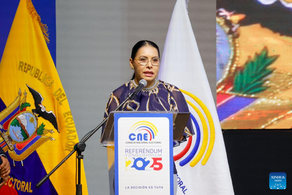 QUITO, 9 noviembre, 2025 (Xinhua) -- La presidenta del Consejo Nacional Electoral (CNE), Diana Atamaint, habla durante el Simulacro Nacional de la Consulta Popular y Referendo 2025, organizado por el CNE en el auditorio de la Universidad Politécnica Salesiana, en la ciudad Quito, en la capital de Ecuador, el 9 de noviembre de 2025. El CNE de Ecuador realizó el domingo un simulacro a nivel nacional de la consulta popular y el referendo constitucional convocados por el Gobierno para el próximo 16 de noviembre, informó la presidenta del organismo, Diana Atamaint. (Xinhua/Ricardo Landeta)