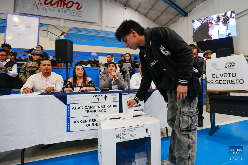 QUITO, 9 noviembre, 2025 (Xinhua) -- Un participante deposita una papeleta en la urna durante el Simulacro Nacional de la Consulta Popular y Referendo 2025, organizado por el Consejo Nacional Electoral (CNE) en el auditorio de la Universidad Politécnica Salesiana, en la ciudad Quito, en la capital de Ecuador, el 9 de noviembre de 2025. El CNE de Ecuador realizó el domingo un simulacro a nivel nacional de la consulta popular y el referendo constitucional convocados por el Gobierno para el próximo 16 de noviembre, informó la presidenta del organismo, Diana Atamaint. (Xinhua/Ricardo Landeta)