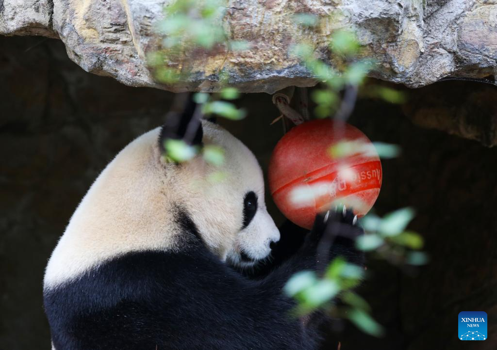 ADELAIDA, 10 noviembre, 2025 (Xinhua) -- La panda gigante Yilan se divierte con un juguete en el Zoológico de Adelaida, en Adelaida, Australia, el 10 de noviembre de 2025. La pareja de pandas gigantes Xingqiu, un macho, e Yilan, una hembra, llegaron a Adelaida el 15 de diciembre de 2024. (Xinhua/Ma Ping)