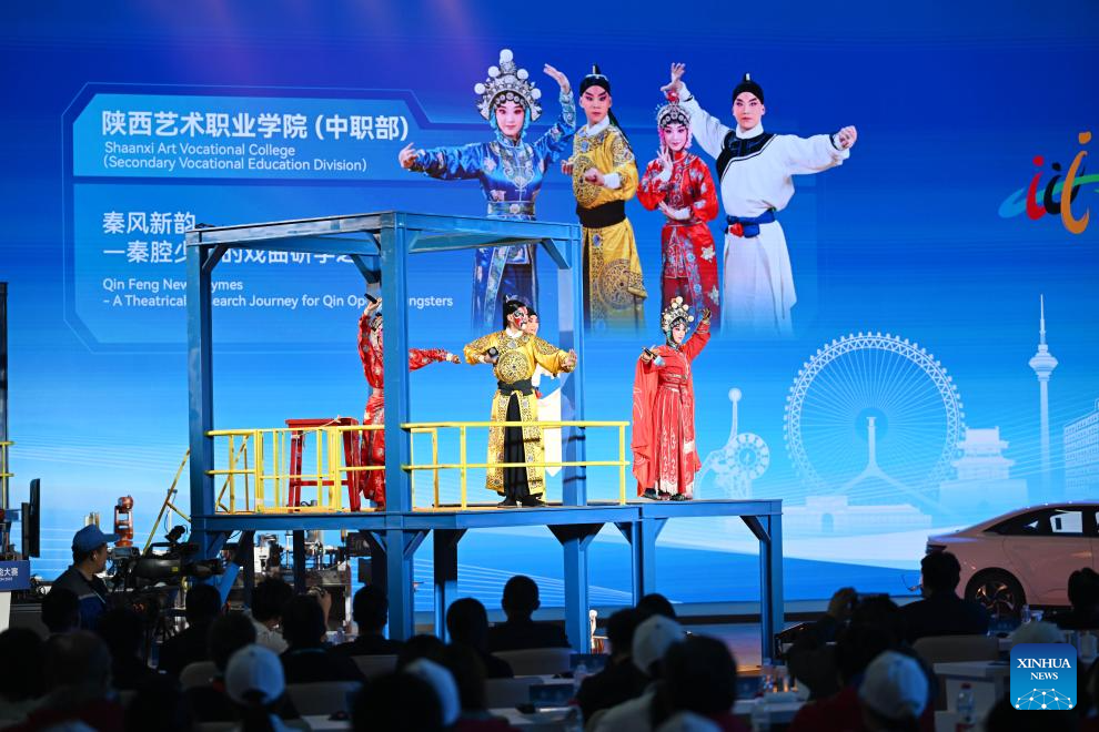 TIANJIN, 14 noviembre, 2025 (Xinhua) -- Concursantes del Colegio Vocacional de Arte de Shaanxi (División de Educación Vocacional Secundaria) compiten durante la Competencia Mundial de Habilidades de Colegios Vocacionales 2025, en Tianjin, en el norte de China, el 14 de noviembre de 2025. Seis equipos participaron aquí el viernes en la final de esta competencia y la Universidad de Tecnología Vocacional de Jinhua obtuvo el campeonato. (Xinhua/Zhao Zishuo)