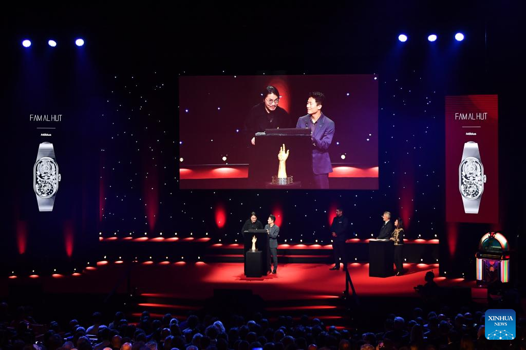 GINEBRA, 14 noviembre, 2025 (Xinhua) -- Imagen del 13 de noviembre de 2025 de Dai Xinyan (c-i), fundador de Fam al Hut, hablando en la ceremonia de premiación del 25 Gran Premio de Relojería de Ginebra (GPHG, por sus siglas en francés), en Ginebra, Suiza. La marca china independiente de relojes Fam al Hut ganó el jueves el Premio Audacity en el 25 GPHG, considerado por muchos como los "Oscar de la Relojería". Esta es la segunda vez que una marca china ha obtenido un premio GPHG. En 2021, la empresa china CIGA Design ganó el Premio Challenge Watch por su modelo original, "el Planeta Azul". (Xinhua/Lian Yi)