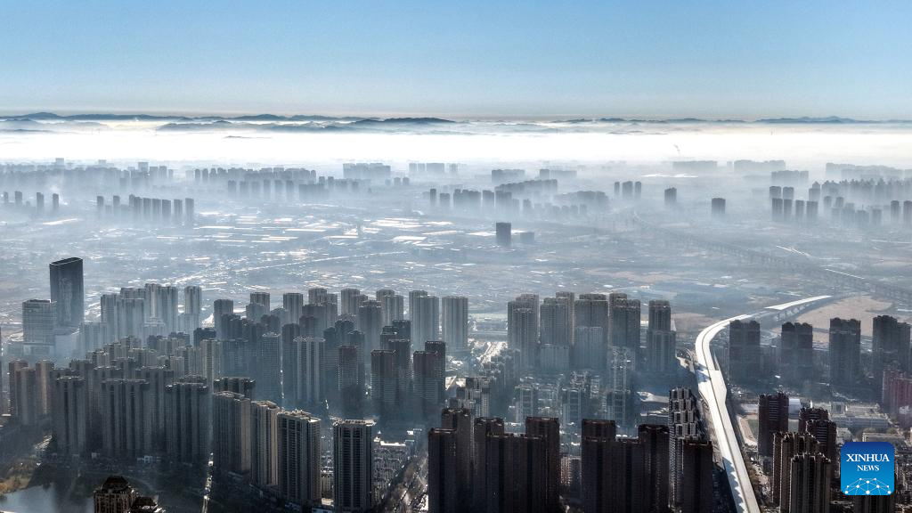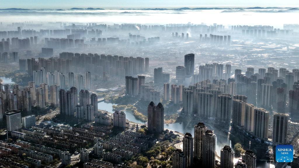 SHENYANG, 14 noviembre, 2025 (Xinhua) -- Vista aérea tomada con dron el 13 de noviembre de 2025 de rascacielos entre la neblina, en Shenyang, en la provincia de Liaoning, en el noreste de China. (Xinhua/Huang Jinkun)