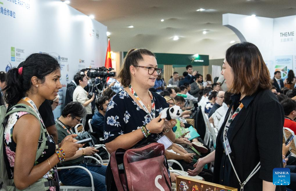 BELEM, 15 noviembre, 2025 (Xinhua) -- Imagen del 12 de noviembre de 2025 de una invitada recibiendo un panda de juguete en el Pabellón de China durante la 30ª Conferencia de las Partes de la Convención Marco de las Naciones Unidas sobre Cambio Climático, conocida comúnmente como COP30, en Belém, Brasil. La COP30 se inauguró el lunes en Belém, Brasil. Las exhibiciones de productos culturales, tecnologías verdes e innovaciones chinas atrajeron la atención de los asistentes durante la conferencia. (Xinhua/Wang Tiancong)