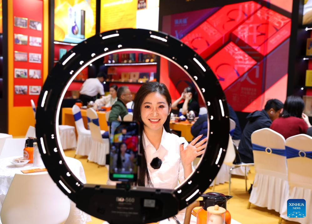 WUYISHAN, 16 noviembre, 2025 (Xinhua) -- Una creadora de contenido en vivo trabaja en la 17 Exposición del Té a través del Estrecho, en Wuyishan, en la provincia de Fujian, en el sureste de China, el 16 de noviembre de 2025. La 17 Exposición del Té a través del Estrecho se inauguró el domingo en la ciudad de Wuyishan de la provincia de Fujian. Con el tema del desarrollo integrado de la cultura del té, la industria y la ciencia y la tecnología, la expo de este año ha atraído a más de 850 empresas, incluidas 173 de Taiwán. Con 2.300 estands que abarcan 48.000 metros cuadrados, el evento incluye cuatro pabellones de exposición principales temáticos. (Xinhua/Huang Jiemin)