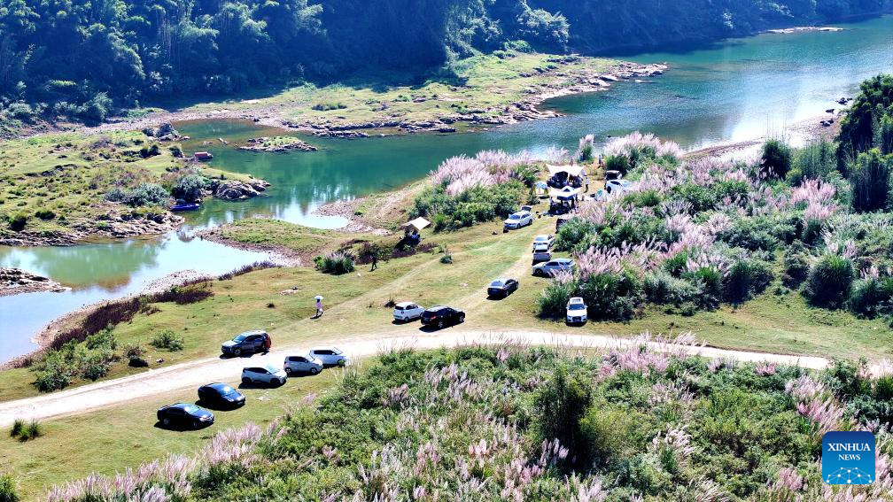 BEIJING, 16 noviembre, 2025 (Xinhua) -- Vista aérea tomada con un dron el 16 de noviembre de 2025 de turistas divirtiéndose junto al río Rongjiang, en el distrito de Liucheng de la ciudad de Liuzhou, en la región autónoma zhuang de Guangxi, en el sur de China. (Xinhua/Tang Xiaokui)