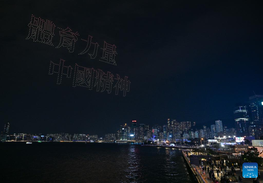 HONG KONG, 18 noviembre, 2025 (Xinhua) -- Un espectáculo de luz con drones que celebra el espíritu deportivo se lleva a cabo en Hong Kong en el sur de China, el 18 de noviembre de 2025. (Xinhua/Chen Duo)