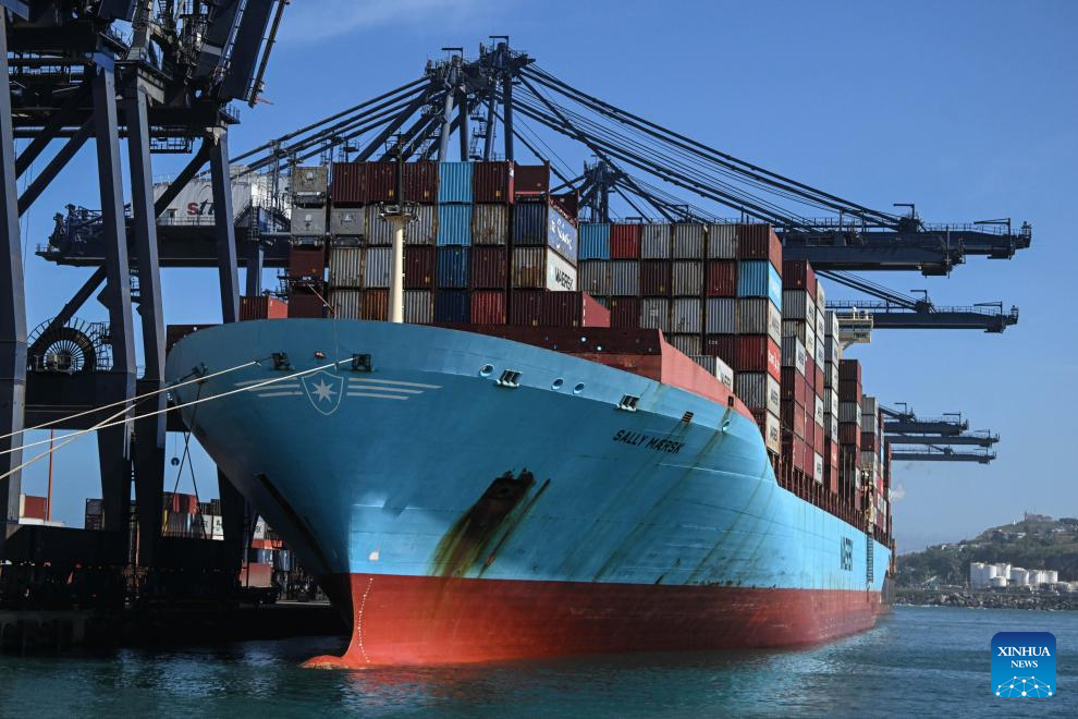 Imagen del 18 de noviembre de 2025 de un buque cargado con contenedores visto durante la ceremonia de lanzamiento de la temporada de exportación de cerezas 2025-2026 en las dependencias de San Antonio Terminal Internacional, en el puerto de San Antonio, en la región de Valparaíso, Chile. Chile comenzó esta semana la temporada de exportación de cerezas frescas 2025-2026 por vía marítima, con barcos de ruta directa hacia China para abastecer al mercado asiático en su temporada invernal. (Xinhua/Jorge Villegas)