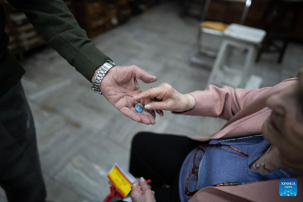 BUENOS AIRES, 19 noviembre, 2025 (Xinhua) -- El maestro botonero, Eduardo Alonso, realiza un grabado artístico en un botón en su establecimiento "El rey de los botones", en la ciudad de Buenos Aires, Argentina, el 19 de noviembre de 2025. Un hombre de 86 años que reside en la capital de Argentina, Buenos Aires, mantiene vivo el oficio de hacer botones, una verdadera pasión artesanal por la que es reconocido a diario por vecinos e incluso turistas, que se acercan a conocer y admirar su esmerada labor en el populoso barrio de Flores. (Xinhua/Martín Zabala)