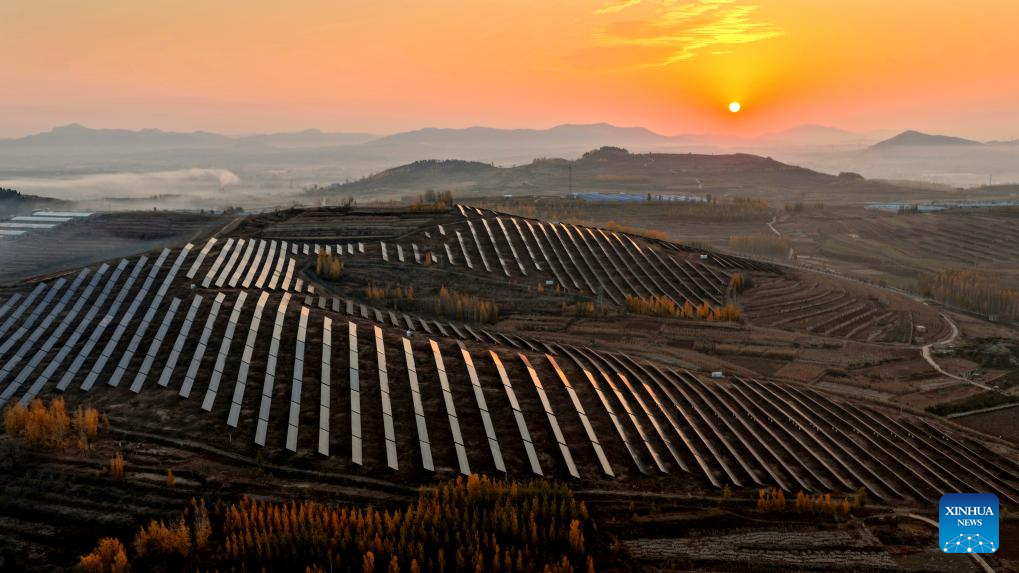 JINAN, 20 noviembre, 2025 (Xinhua) -- Vista aérea tomada con un dron del 14 de noviembre de 2025 de una base fotovoltaica, en Dongsanzhuang del distrito de Mengyin en la ciudad de Linyi, en la provincia de Shandong, en el este de China. En 2020, China anunció que se esforzaría por alcanzar el pico de emisiones de dióxido de carbono antes de 2030 y la neutralidad de carbono antes de 2060. (Xinhua/Gong Maodong)