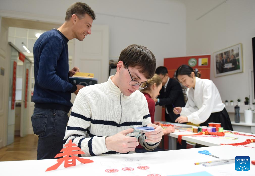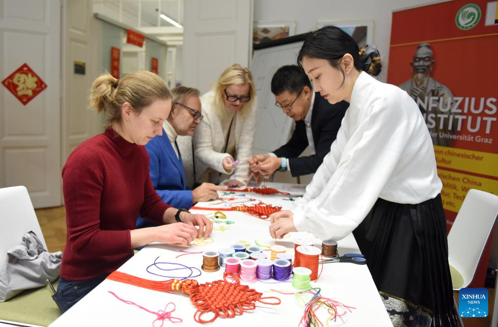 GRAZ, 22 noviembre, 2025 (Xinhua) -- Imagen del 21 de noviembre de 2025 de invitados probando la elaboración de nudos chinos en un evento para celebrar el 15º aniversario del Instituto Confucio de la Universidad de Graz, en Graz, Austria. (Xinhua/He Canling)