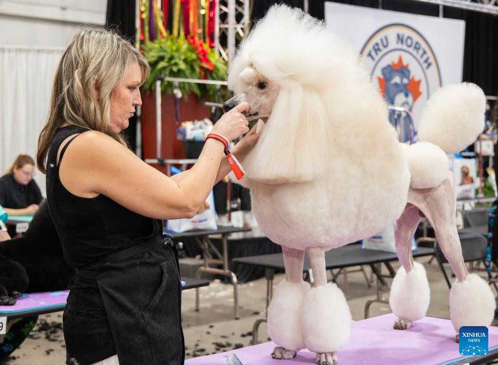 MISSISSAUGA, 23 noviembre, 2025 (Xinhua) -- Imagen del 22 de noviembre de 2025 de una peluquera de mascotas trabajando en un perro durante la Exposición Canadiense de Mascotas de Navidad 2025 en Mississauga, Ontario, Canadá. Con diferentes competencias de mascotas y un mercado navideño, este evento anual de dos días comenzó aquí el sábado. (Xinhua/Zou Zheng)