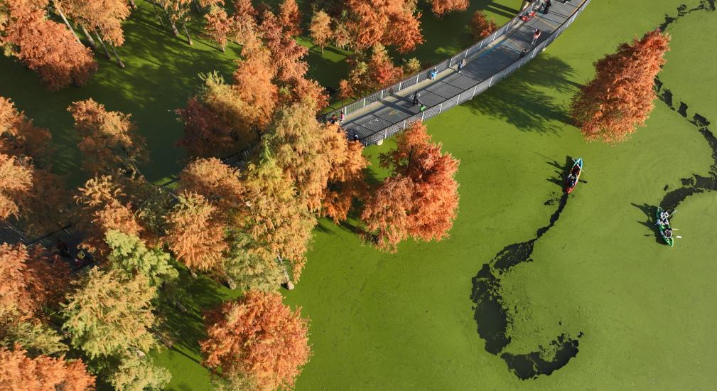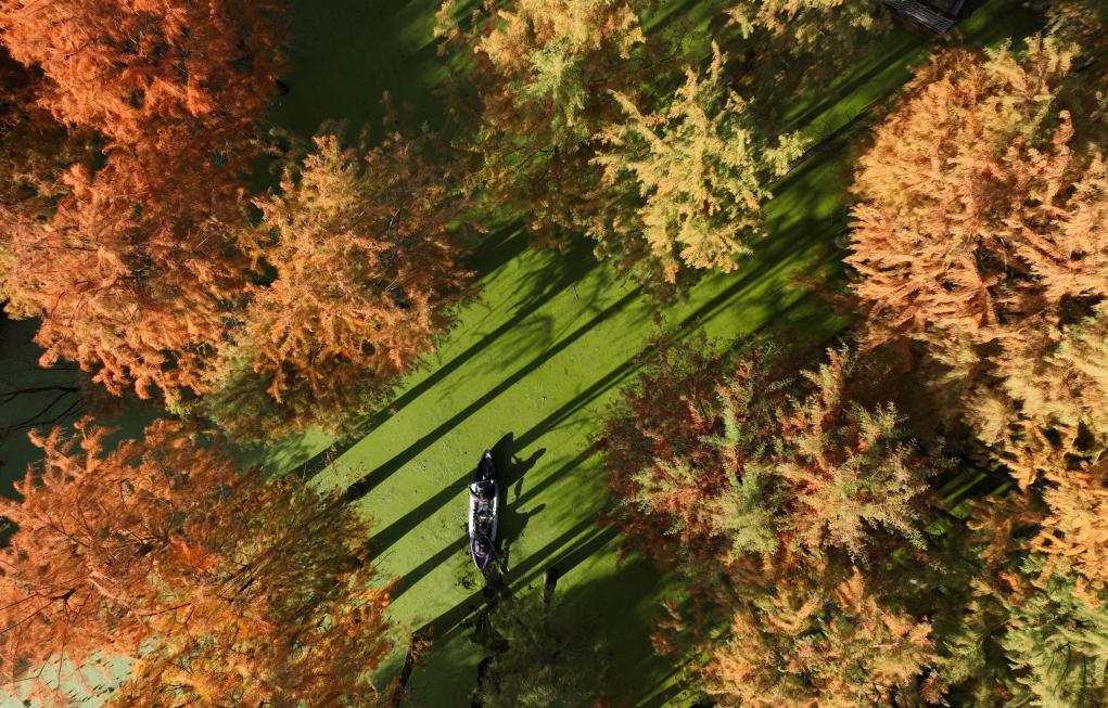 HANGZHOU, 28 noviembre, 2025 (Xinhua) -- Vista aérea tomada con dron el 28 de noviembre de 2025 de turistas remando a través de un bosque anegado en el punto escénico del lago Qingshan, en el distrito de Lin'an de la ciudad de Hangzhou, en la provincia de Zhejiang, en el este de China. El lago Qingshan, un lago artificial en el distrito de Lin'an de la ciudad de Hangzhou, es conocido por su bosque anegado. (Xinhua/Weng Xinyang)