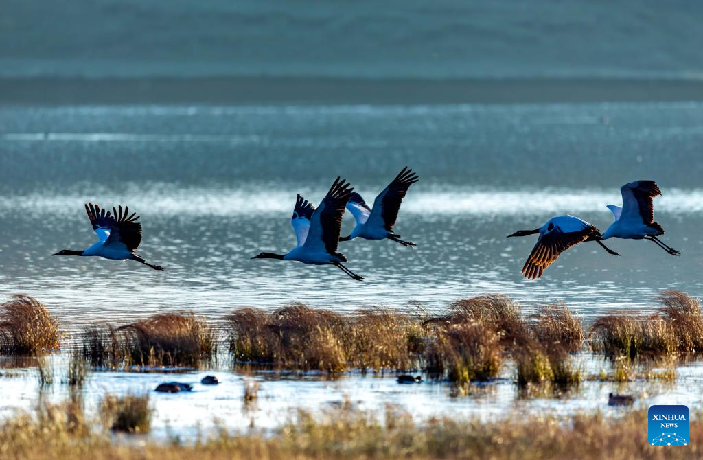 ZHAOTONG, 30 noviembre, 2025 (Xinhua) -- Imagen del 29 de noviembre de 2025 de grullas de cuello negro volando sobre un humedal de la Reserva Nacional Natural de Dashanbao de Yunnan para Grullas de Cuello Negro, en la ciudad de Zhaotong, en la provincia de Yunnan, en el suroeste de China. La Reserva Nacional Natural de Dashanbao de Yunnan para Grullas de Cuello Negro es un importante hábitat invernal y estación de tránsito para las grullas de cuello negro migratorias en la meseta Yunnan-Guizhou. Actualmente, más de mil grullas de cuello negro han llegado a la reserva para pasar el invierno aquí. (Xinhua/Chen Xi)