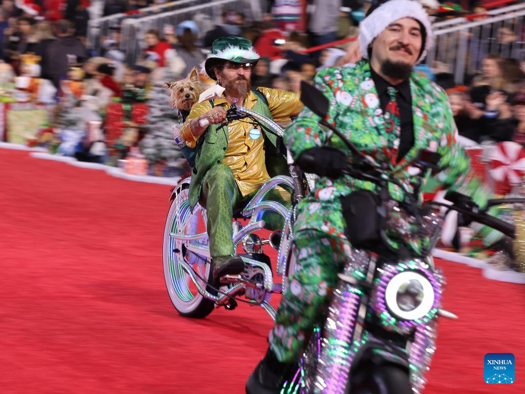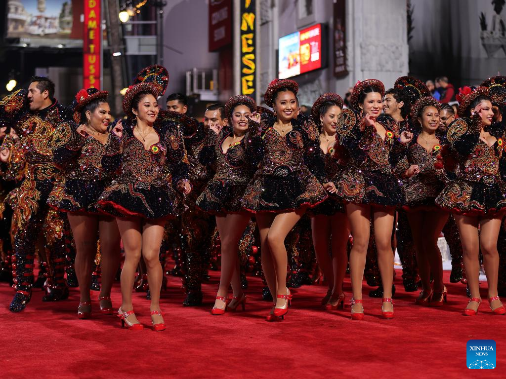 LOS ANGELES, 1 diciembre, 2025 (Xinhua) -- Imagen del 30 de noviembre de 2025 de bailarinas realizando una presentación por el Bulevar Hollywood durante el 93° Desfile Anual Navideño de Hollywood, en Los Angeles, California, Estados Unidos. (Xinhua/Qiu Chen)