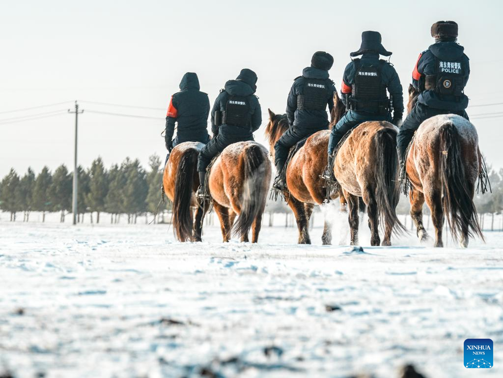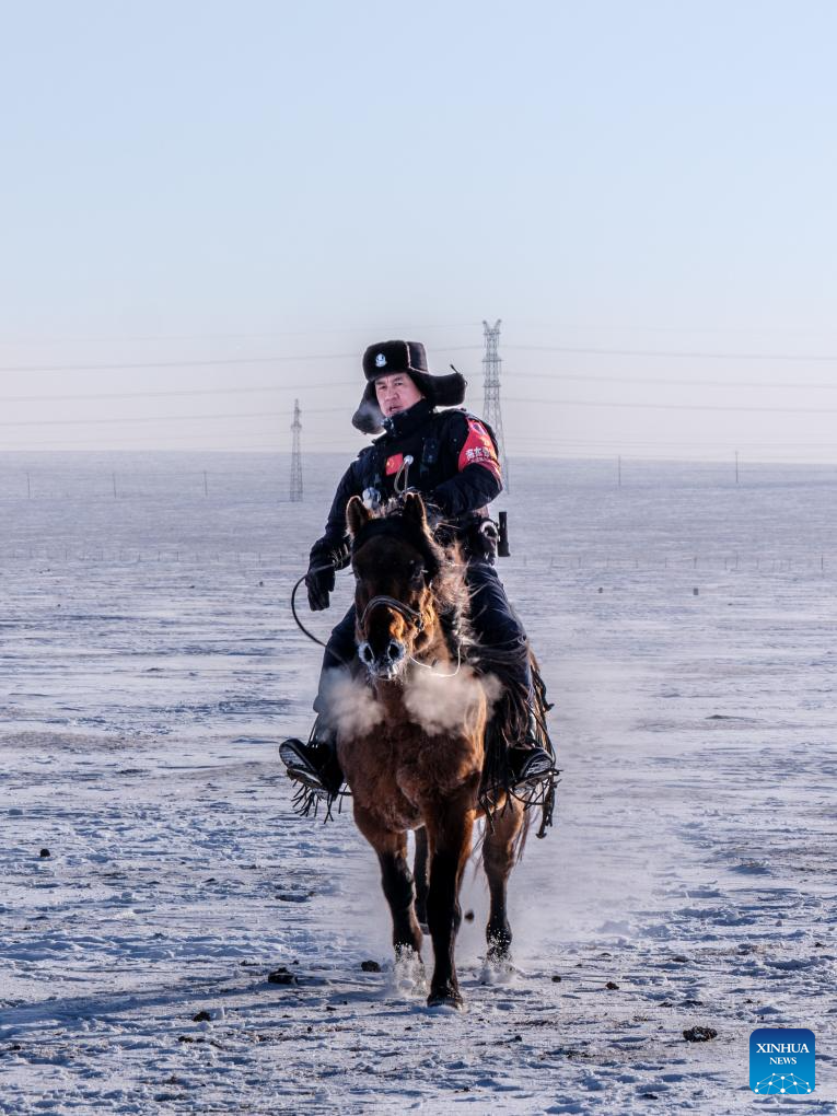 HULUN BUIR, 4 diciembre, 2025 (Xinhua) -- Imagen del 2 de diciembre de 2025 de un policía del equipo de policía montada "Halcón gerifalte" realizando tareas de guardia afuera de una escuela primaria, en la Bandera de Chenbarhu en Hulun Buir, en la región autónoma de Mongolia Interior, en el norte de China. En lo profundo de la pradera cubierta de nieve de la Bandera de Chenbarhu, una fila de policías montados patrulla a caballo, lucha contra las ráfagas de viento y la nieve. Ellos realizan patrullajes de seguridad y gestión en la vasta pradera que abarca una superficie de 18.600 kilómetros cuadrados. (Xinhua/Ma Jinrui)
