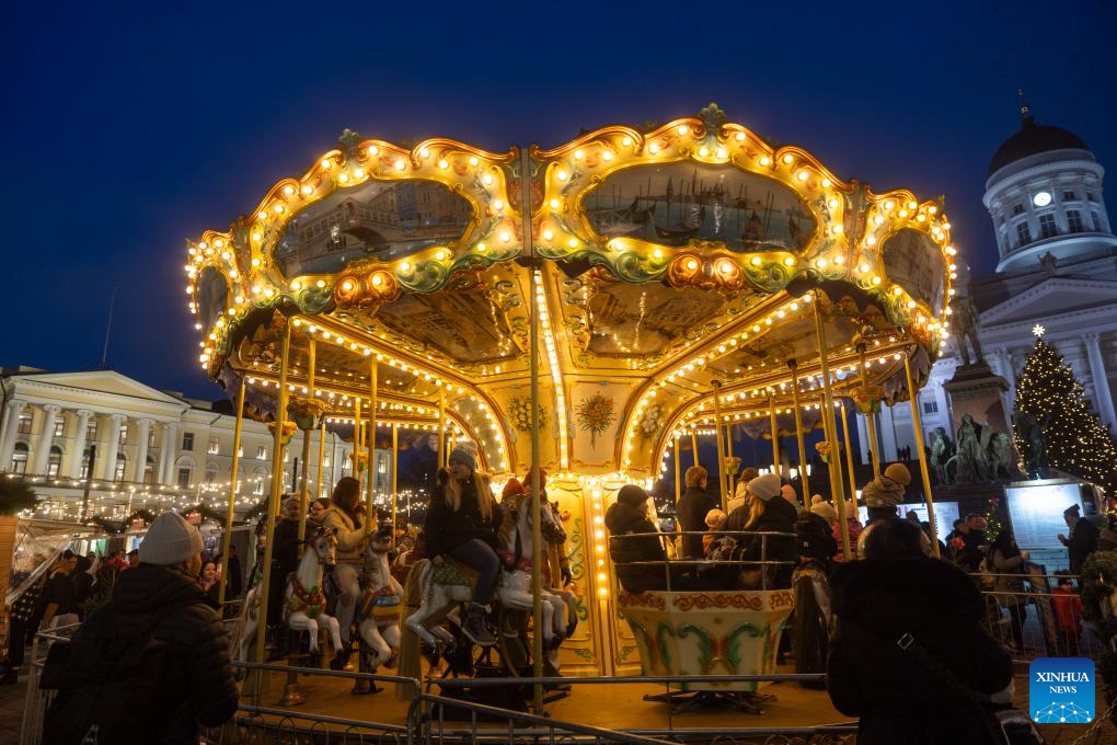 HELSINKI, 5 diciembre, 2025 (Xinhua) -- Personas suben a un carrusel en el Mercado Navideño de Helsinki, en Helsinki, Finlandia, el 5 de diciembre de 2025. Ubicado en la Plaza del Senado, en el corazón de la ciudad, el Mercado Navideño de Helsinki es una histórica feria navideña al aire libre que atrae a un gran número de visitantes cada año. (Xinhua/Matti Matikainen)