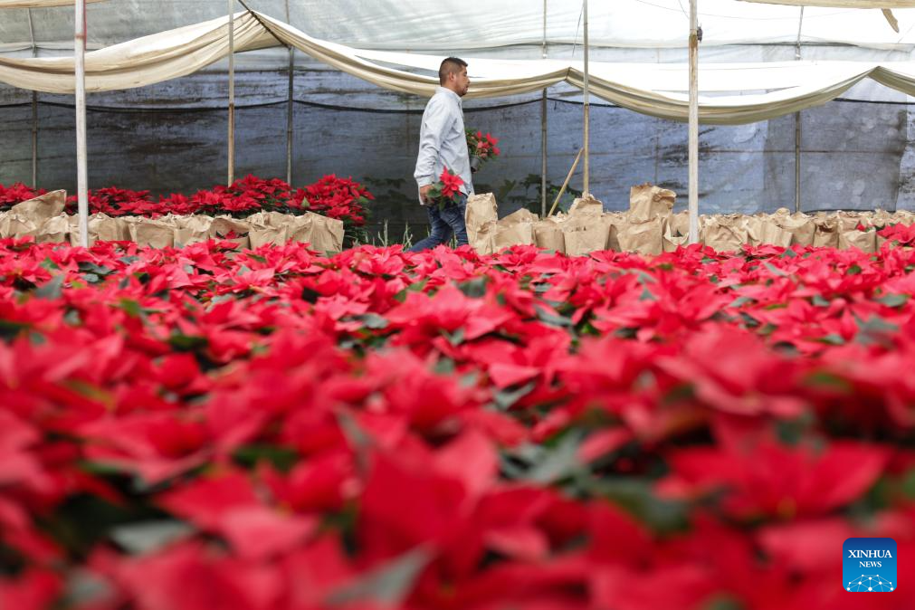 CIUDAD DE MEXICO, 6 diciembre, 2025 (Xinhua) -- Imagen del 5 de diciembre de 2025 de un hombre transportando flores de Nochebuena, en la Ciudad de México, capital de México. (Xinhua/Francisco Cañedo)