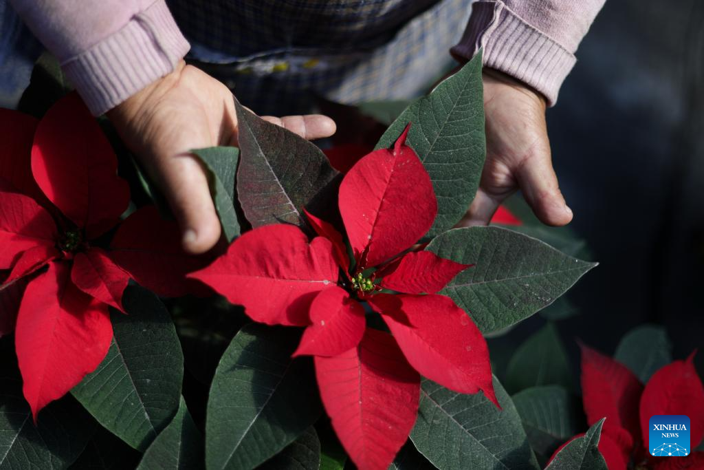 CIUDAD DE MEXICO, 6 diciembre, 2025 (Xinhua) -- Imagen del 5 de diciembre de 2025 de una mujer acomodando flores de Nochebuena, en la Ciudad de México, capital de México. (Xinhua/Francisco Cañedo)