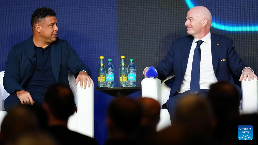 WASHINGTON D. C., 7 diciembre, 2025 (Xinhua) -- Imagen del 6 de diciembre de 2025 del exjugador brasileño, Ronaldo Nazario y el presidente de la FIFA, Gianni Infantino, conversando durante la develación del calendario de partidos para la Copa Mundial 2026, en Washington D. C., Estados Unidos. (Xinhua/Jia Haocheng)