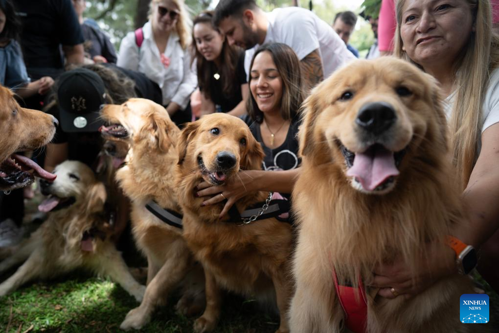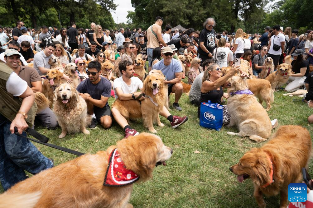 BUENOS AIRES, 8 dic (Xinhua) -- Una ola dorada compuesta por unos 2.000 perros de la raza "golden retriever" llenó hoy lunes de color y diversión la zona norte de la capital argentina, Buenos Aires, tras una convocatoria realizada por redes sociales para reunir ejemplares de la raza canina que se caracteriza por ser juguetona y extrovertida.