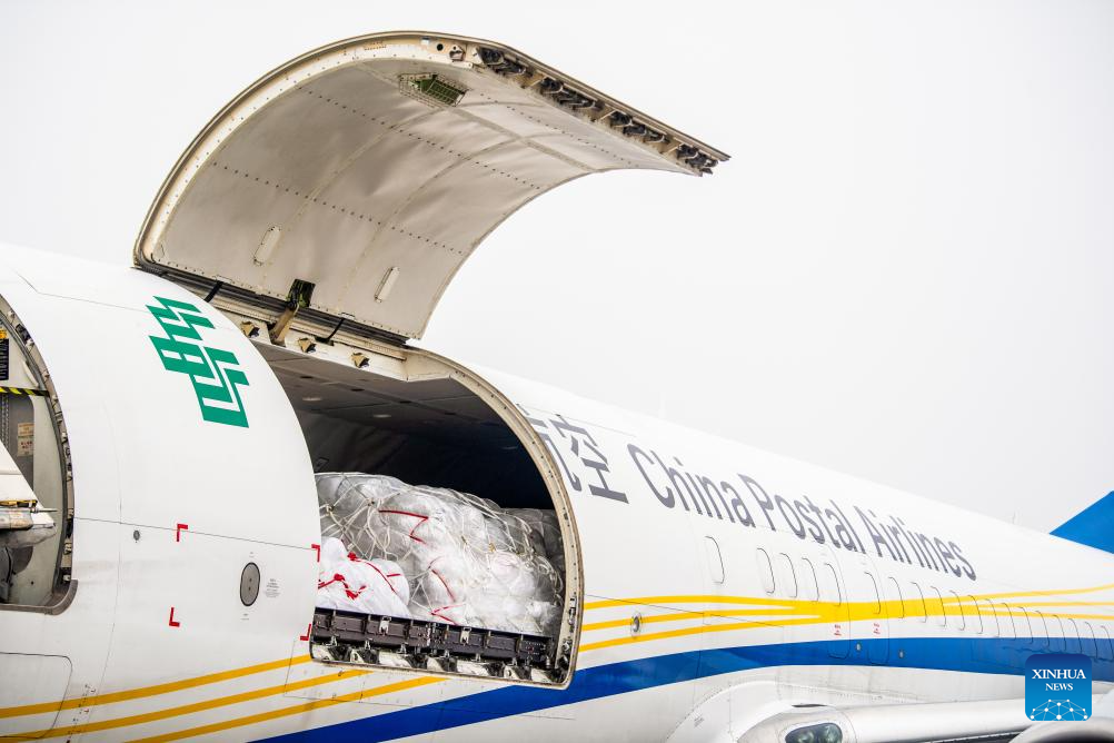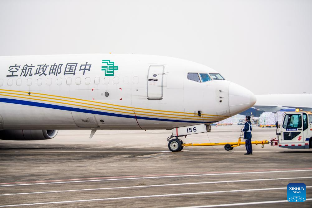 CHONGQING, 9 diciembre, 2025 (Xinhua) -- Imagen del 9 de diciembre de 2025 de un avión de China Postal Airlines esperando para realizar el vuelo inaugural de la ruta de carga Chongqing-Yangón en el Aeropuerto Internacional Jiangbei de Chongqing, en el municipio de Chongqing, en el suroeste de China. Una ruta internacional de carga que conecta la municipalidad de Chongqing, en el suroeste de China, y Yangon, en Myanmar, realizó con éxito su vuelo inaugural el martes. (Xinhua/Tang Yi)