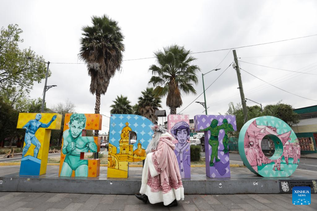 CIUDAD DE MEXICO, 10 diciembre, 2025 (Xinhua) -- Imagen del 8 de diciembre de 2025 del "Santa Iluminado", personaje caracterizado por el artista José Miguel Moctezuma, recorriendo una calle del barrio de Tepito, en la Ciudad de México, capital de México. (Xinhua/Francisco Cañedo)
