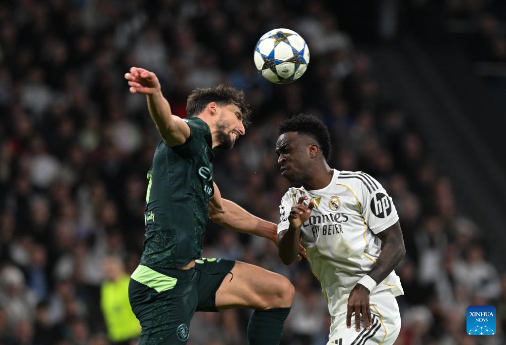 MADRID, 11 diciembre, 2025 (Xinhua) -- Imagen del 10 de diciembre de 2025 de Vinicius Junior (d), de Real Madrid, cabeceando el balón durante el partido de fútbol de la Liga de Campeones de la UEFA, entre Real Madrid y Manchester City, en Madrid, España. (Xinhua/Cheng Min)