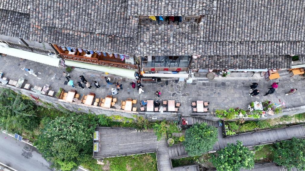 CHONGQING, 11 diciembre, 2025 (Xinhua) -- Vista aérea tomada con un dron del 11 de diciembre de 2025 de turistas visitando el antiguo poblado de Gongtan, en el distrito autónomo tujia y miao de Youyang, en la municipalidad de Chongqing, en el suroeste de China. (Xinhua/Qiu Hongbin)