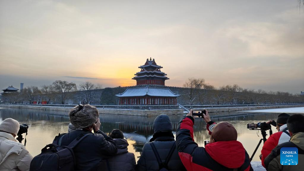 BEIJING, 13 diciembre, 2025 (Xinhua) -- Imagen del 13 de diciembre de 2025 del paisaje nevado al amanecer cerca de una torreta del Museo del Palacio, en Beijing, China. Beijing atestiguó el viernes su primera nevada significativa de esta temporada invernal. (Xinhua/Xing Guangli)