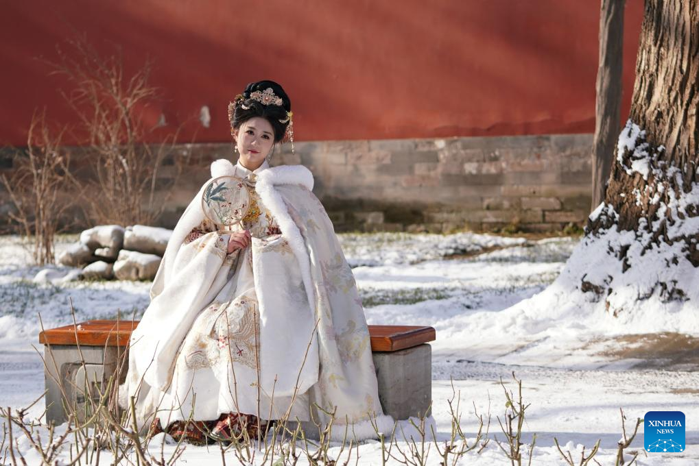 BEIJING, 13 diciembre, 2025 (Xinhua) -- Una turista posa para fotografías en el Museo del Palacio tras una nevada, en Beijing, capital de China, el 13 de diciembre de 2025. (Xinhua/Ma Xiaodong)