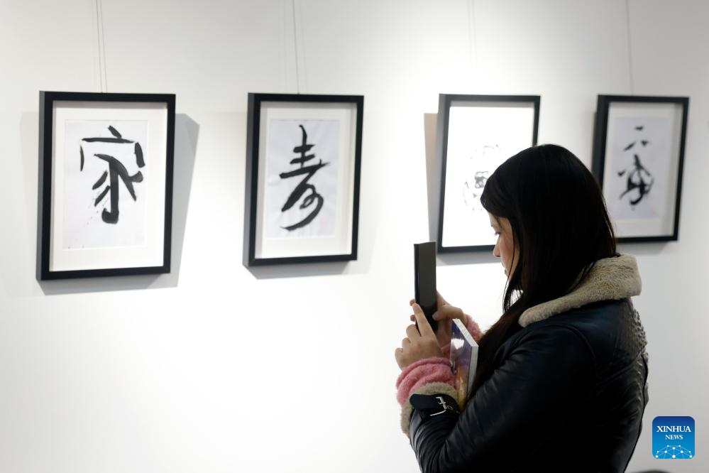 BUCAREST, 14 diciembre, 2025 (Xinhua) -- Imagen del 13 de diciembre de 2025 de una visitante tomando fotografías de caligrafía tradicional china durante el día de apertura de la 4ª edición de la Feria del Libro Buchina en el Centro Cultural Chino, en Bucarest, Rumanía. Buchina es una feria del libro dedicada a la literatura, la cultura y el arte chinos. (Xinhua/Cristian Cristel)
