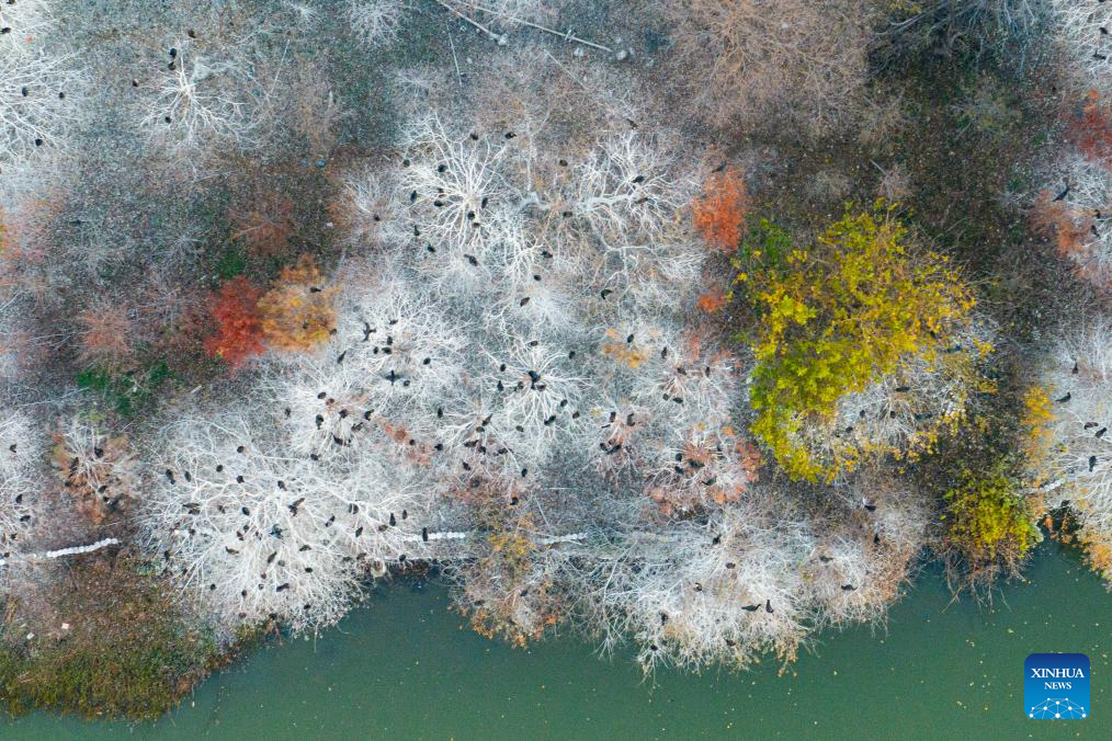WUHAN, 16 diciembre, 2025 (Xinhua) -- Vista aérea tomada con un dron el 16 de diciembre de 2025 de aves descansando en los árboles en el área escénica del Lago Donghu, en Wuhan, en la provincia de Hubei, en el centro de China. (Xinhua/Xiao Yijiu)