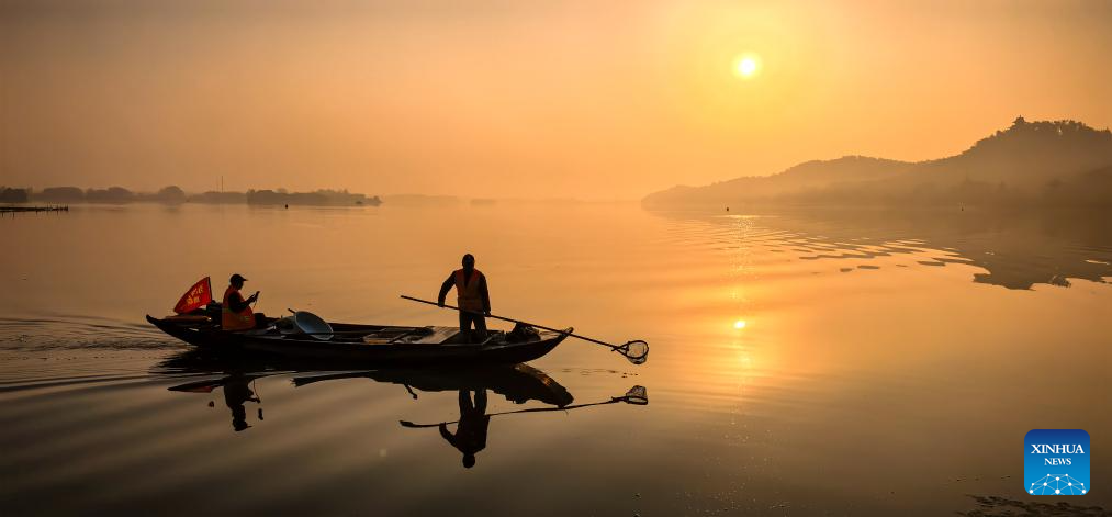 WUHAN, 16 diciembre, 2025 (Xinhua) -- Imagen del 16 de noviembre de 2025 de un empleado limpiando objetos flotantes en el área escénica del Lago Donghu, en Wuhan, en la provincia de Hubei, en el centro de China. (Xinhua/Shen Hongbing)