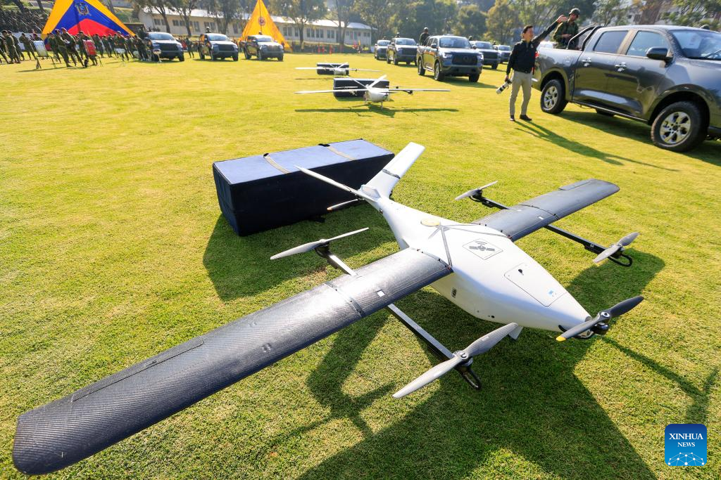 Drones de reconocimiento y equipos tecnológicos son vistos durante la ceremonia de entrega de nuevo equipamiento a las Fuerzas Armadas llevada a cabo en el Fuerte Militar Eplicachima, en Quito, capital de Ecuador, el 16 de diciembre de 2025. El presidente de Ecuador, Daniel Noboa, entregó el martes nuevo equipamiento a las Fuerzas Armadas para fortalecer su capacidad logística y operativa en la lucha contra el "narcoterrorismo", que afecta al país sudamericano. (Xinhua/Ricardo Landeta)