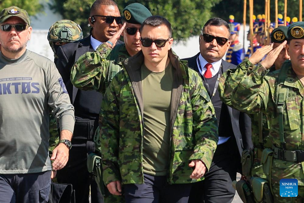 El presidente ecuatoriano, Daniel Noboa (c), asiste a la ceremonia de entrega de nuevo equipamiento a las Fuerzas Armadas llevada a cabo en el Fuerte Militar Eplicachima, en Quito, capital de Ecuador, el 16 de diciembre de 2025. Noboa entregó el martes nuevo equipamiento a las Fuerzas Armadas para fortalecer su capacidad logística y operativa en la lucha contra el "narcoterrorismo", que afecta al país sudamericano. (Xinhua/Ricardo Landeta)