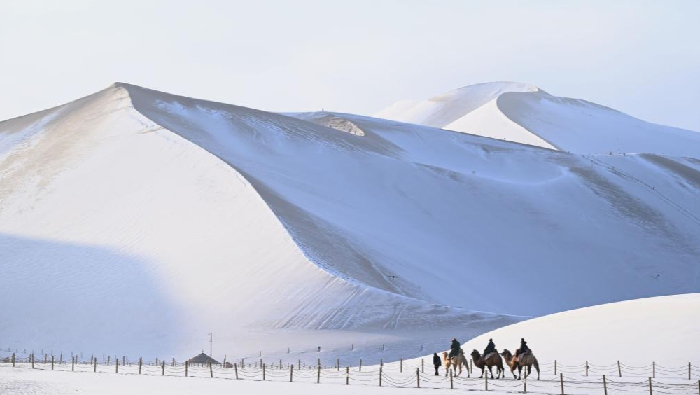 BEIJING, 16 diciembre, 2025 (Xinhua) -- Imagen del 12 de diciembre de 2025 de turistas montando camellos para disfrutar del paisaje nevado en el Area Escénica de la Montaña Mingsha y el Manantial de la Luna Creciente, en la ciudad de Dunhuang, en la provincia de Gansu, en el noroeste de China. (Xinhua/Zhang Xiaoliang)
