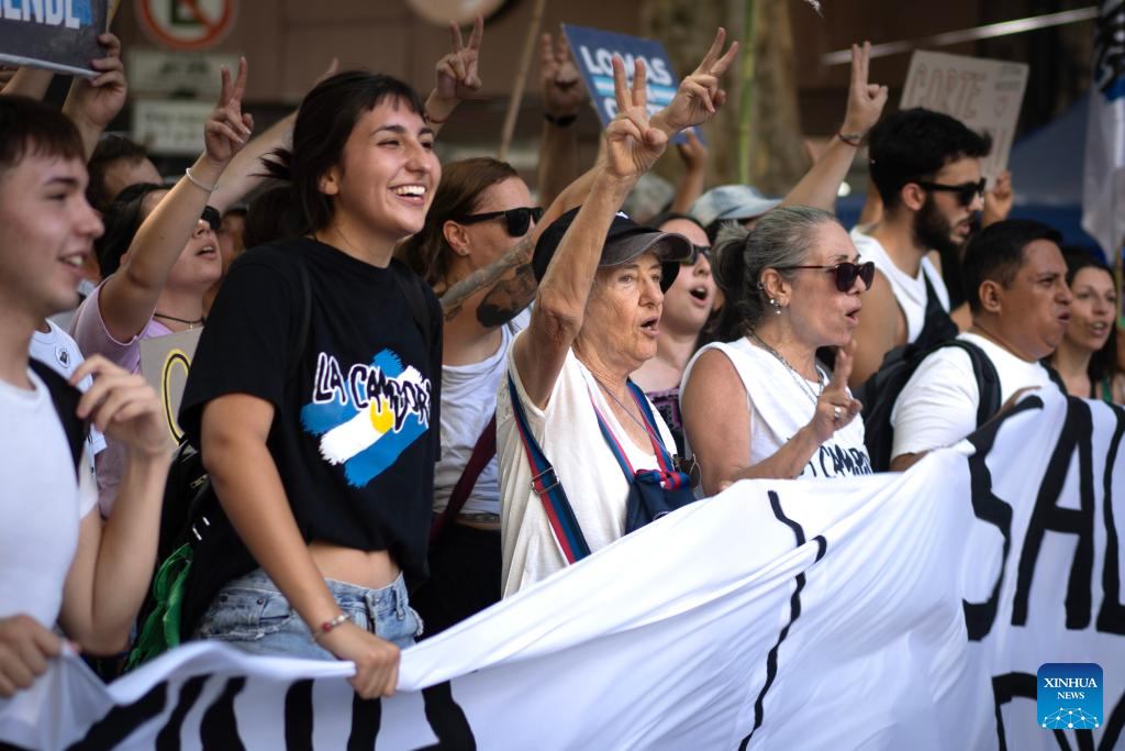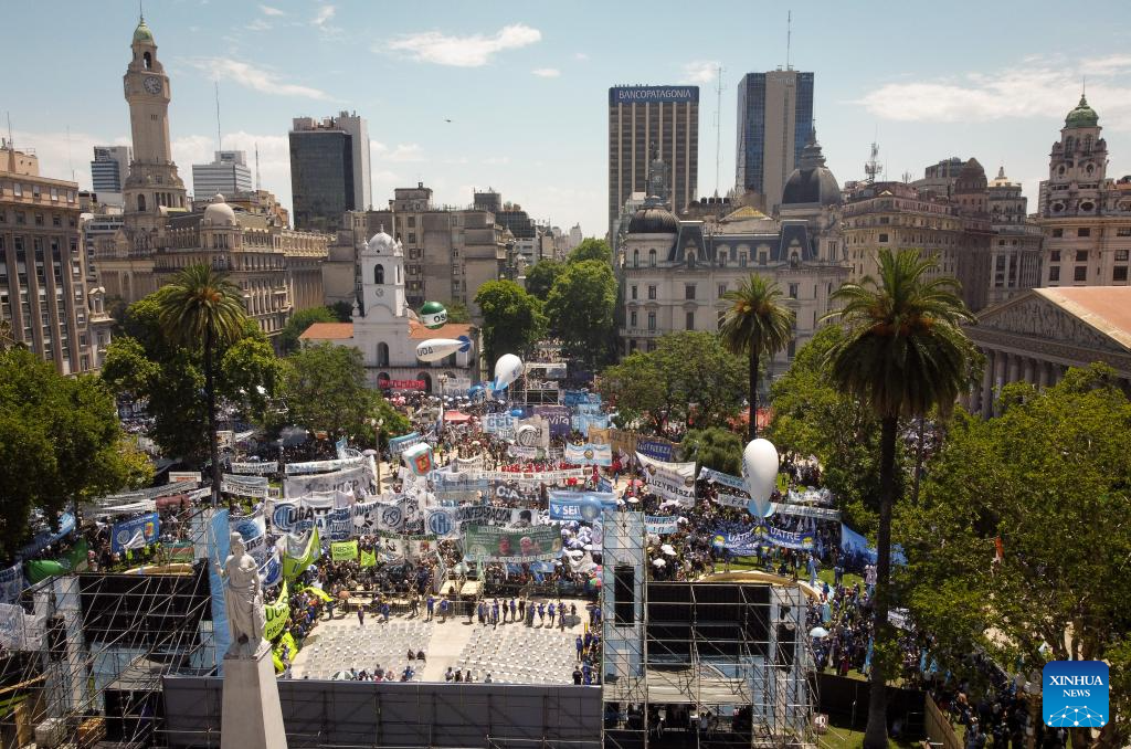 BUENOS AIRES, 18 dic (Xinhua) -- La Confederación General del Trabajo (CGT) y otras centrales sindicales de Argentina se movilizaron hoy jueves a la emblemática Plaza de Mayo, en el centro de la ciudad de Buenos Aires, para expresar su rechazo a un proyecto de reforma laboral que impulsa el Gobierno del presidente Javier Milei.