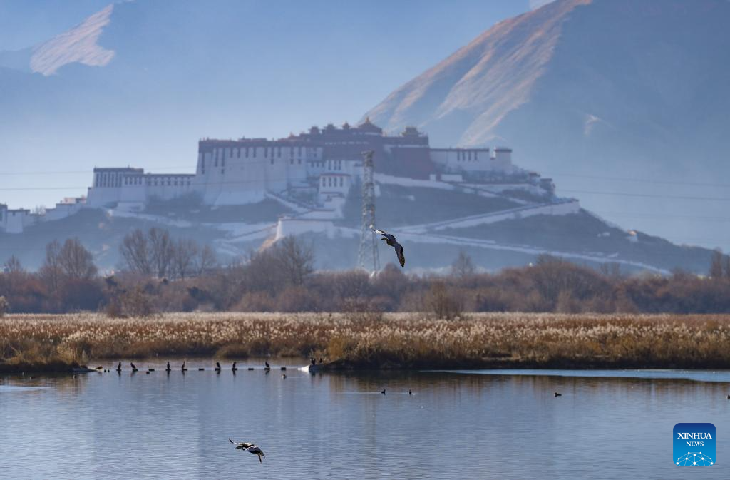 LHASA, 20 diciembre, 2025 (Xinhua) -- Gansos de cabeza barrada son vistos en la Reserva Natural Nacional del Humedal de Lhalu, con el Palacio de Potala al fondo, en Lhasa, en la región autónoma de Xizang, en el suroeste de China, el 20 de diciembre de 2025. Verificada por la Agencia de Certificación de Récords Mundiales (WRCA, por sus siglas en inglés), la Reserva Natural Nacional del Humedal de Lhalu ha sido confirmada como el "humedal natural urbano de mayor altitud". La ceremonia de certificación se llevó a cabo el sábado en el humedal. Ubicado en el área urbana de Lhasa, el humedal abarca una superficie de 12,2 kilómetros cuadrados a una altitud promedio de 3.649 metros. (Xinhua/Jigme Dorje)