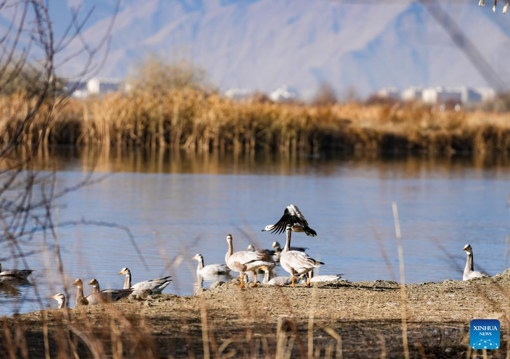 LHASA, 20 diciembre, 2025 (Xinhua) -- Gansos de cabeza barrada son vistos en la Reserva Natural Nacional del Humedal de Lhalu, en Lhasa, en la región autónoma de Xizang, en el suroeste de China, el 20 de diciembre de 2025. Verificada por la Agencia de Certificación de Récords Mundiales (WRCA, por sus siglas en inglés), la Reserva Natural Nacional del Humedal de Lhalu ha sido confirmada como el "humedal natural urbano de mayor altitud". La ceremonia de certificación se llevó a cabo el sábado en el humedal. Ubicado en el área urbana de Lhasa, el humedal abarca una superficie de 12,2 kilómetros cuadrados a una altitud promedio de 3.649 metros. (Xinhua/Jigme Dorje)