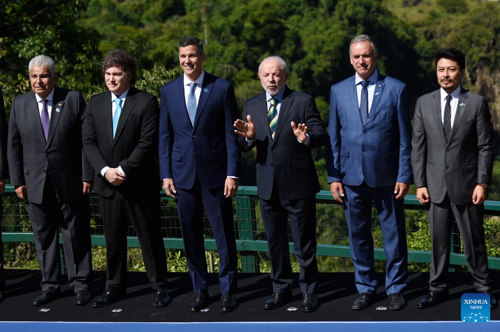 FOZ DO IGUACU, 20 diciembre, 2025 (Xinhua) -- (De izq. a der.) El presidente panameño, José Raúl Mulino, el presidente argentino, Javier Milei, el presidente paraguayo, Santiago Peña, el presidente brasileño, Luiz Inácio Lula da Silva, el presidente uruguayo, Yamandú Orsi, y el ministro de Relaciones Exteriores boliviano, Fernando Aramayo, posan para una fotografía familiar durante la 67ª Cumbre de Jefes de Estado del Mercado Común del Sur (Mercosur), en Foz do Iguacu, Brasil, el 20 de diciembre de 2025. Lula da Silva abrió el sábado en la ciudad de Foz do Iguacu, estado de Paraná, la 67ª Cumbre de Jefes de Estado del Mercosur, afirmando que el bloque es un ejemplo de multilateralismo y que "el mundo está ávido por cerrar acuerdos" con él. (Xinhua/Lucio Tavora)