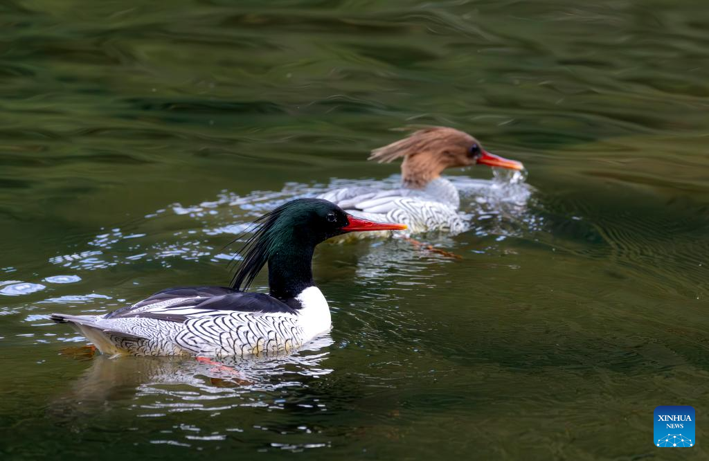 FUZHOU, 21 diciembre, 2025 (Xinhua) -- Imagen del 20 de diciembre de 2025 de serratas chinas nadando en el río Dazhang, en el distrito de Yongtai, en la provincia de Fujian, en el sureste de China. Dieciséis serratas chinas, una especie protegida de primera clase a nivel nacional, fueron avistadas invernando aquí. (Xinhua/Wei Peiquan)
