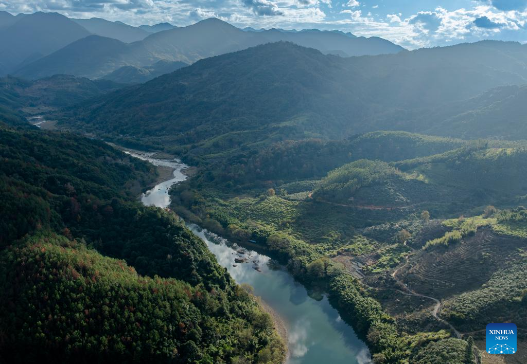 FUZHOU, 21 diciembre, 2025 (Xinhua) -- Vista aérea tomada con un dron del 20 de diciembre de 2025 del río Dazhang, en el distrito de Yongtai, en la provincia de Fujian, en el sureste de China. Dieciséis serratas chinas, una especie protegida de primera clase a nivel nacional, fueron avistadas invernando aquí. (Xinhua/Wei Peiquan)